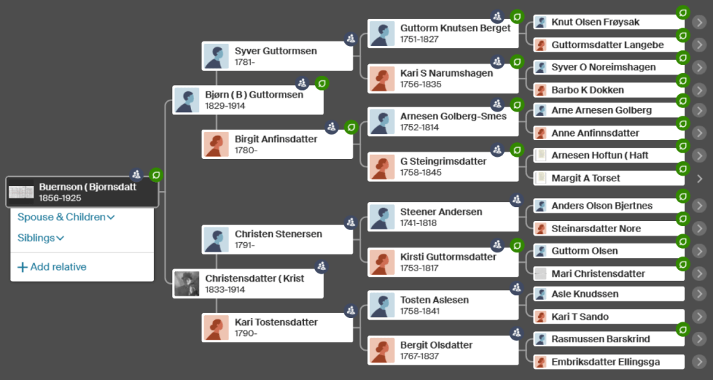 (Note: the source for Medgarden linked above indicates that Kari married a different man (Ole Nilsson) and had no children. If true, a different Kari would have married Christen Stenersen. The marriage record seems to have her place surname at marriage as “Hertsgaard” but no such farm seems to be recorded. Note that the use of “Kari” for her second/third daughter could indicate her mother was also named “Kari” as the tradition was to name the first daughter after the husband’s mother and the second after the wife’s mother. Note however that her next daughter was named “Bergit” which matches the woman here, and the might have named her second daughter after herself, which was also common. The Medgarden source could be in error on this point, but it’s a caveat for this whole line.)