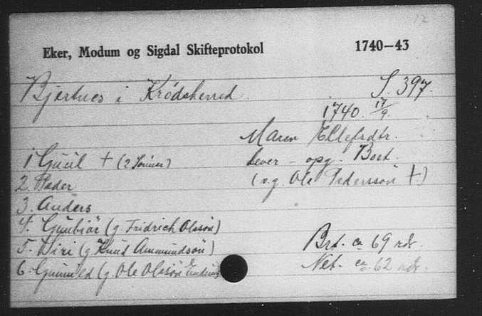 He is listed on a 1740 probate record for Bjertnes (a farm in Krødsherad) as the son of Ola Pedersen and Mari Ellefsdatter.