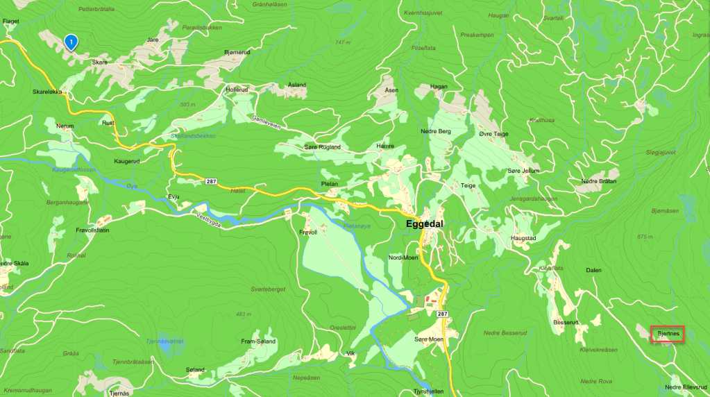 Anders is first recorded in a marriage to Turi Steinarsdatter Nore in 1734 or 1735 in “Xhered” – that seems to be an abbreviation for Krødsherad, then part of Sigdal parish. The current location seems to be east of Eggedal.