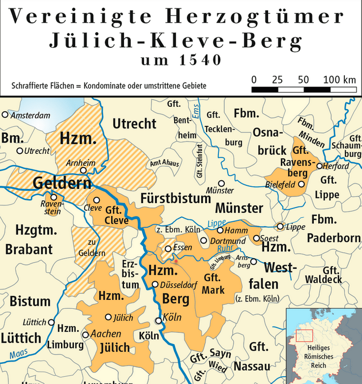 The political geography of the area was historically complicated. Langenberg was historically barely in the County of the Mark, just west of the Duchy of Berg (Velbert proper was in the Duchy of Berg). The regions in the map below were from 1511-1614 the United Duchies of Jülich-Cleves-Berg (which included both Mark and Berg), and after the male line died out in 1609 there was a succession crisis until the late Duke’s daughters married men who split the territories. Berg and Jülich became part of the Palatinate-Neuburg. Cleve and the Mark (and thus Langenberg) became part of the Electorate of Brandenburg in 1614, and then part of Prussia in 1701.