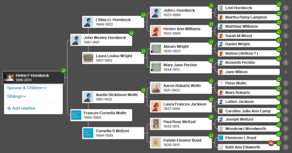 Spike Tanner married Helen Hornbeck. The following genealogy traces some of the known ancestry of Helen Hornbeck Tanner. For a biography of Helen, see here.